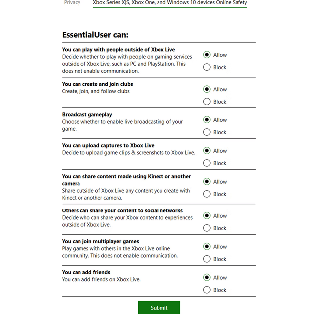 Xbox Series X|S, Xbox One, and Windows 10 devices Online Safety at the top.Set the following options to